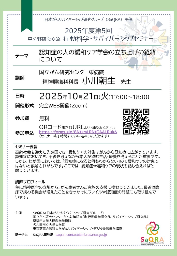 主催:SaQRA(日本がんサバイバーシップ研究グループ)、国立がん研究センターがん対策研究所(行動科学研究部・サバイバーシップ研究部)、早稲田大学人間科学学術院 ・名古屋市立大学大学院、東京慈恵会医科大学がんサバイバーシップ・デジタル医療学講座