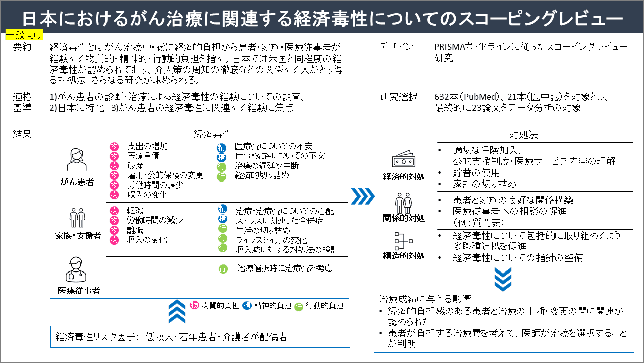 そこで私たちは、日本の実態として、経済毒性の経験の理解と、支援策の提案を目的として、過去の研究結果を整理しました。