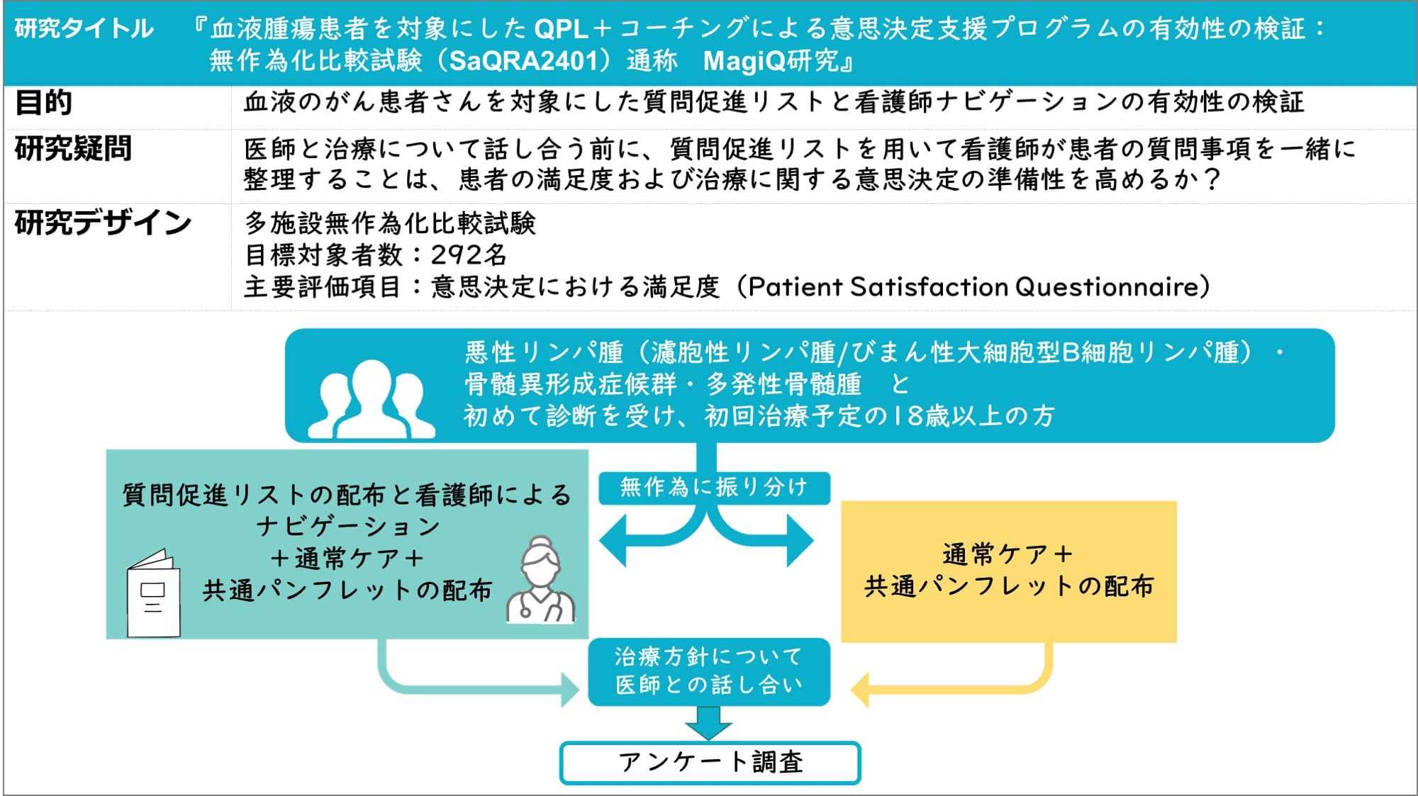 MagiQ研究では、医師との話し合いの前に、質問例を記載した質問促進リストを用い、患者が気になることや医師にたずねたいことを整理できるよう、看護師がナビゲーションを行う意思決定支援プログラムを提供する。本プログラムは、血液がん患者が納得して治療を選択できるよう支援し、その結果として患者の治療に関する意思決定の満足度が向上することを目指すものである。