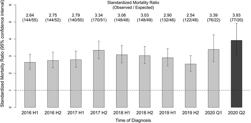全国がん登録データを用いて、2016年以降に日本で診断されたがん患者の半年以内の自殺による死亡リスク(標準化死亡比)を算出しました。このリスクがCOVID-19パンデミック中に診断された患者ではどのように変化したのかを分析しました。